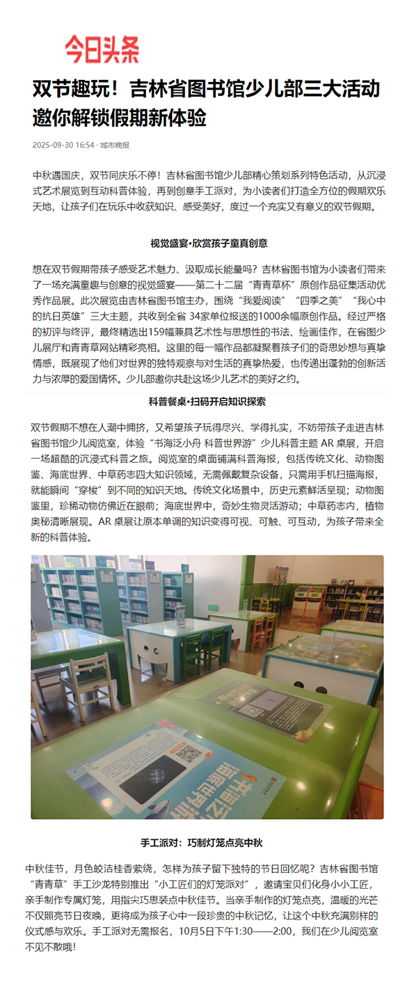 2025.9.30 《今日头条》 双节趣玩!省图少儿部三大活动邀你解锁假期新体验