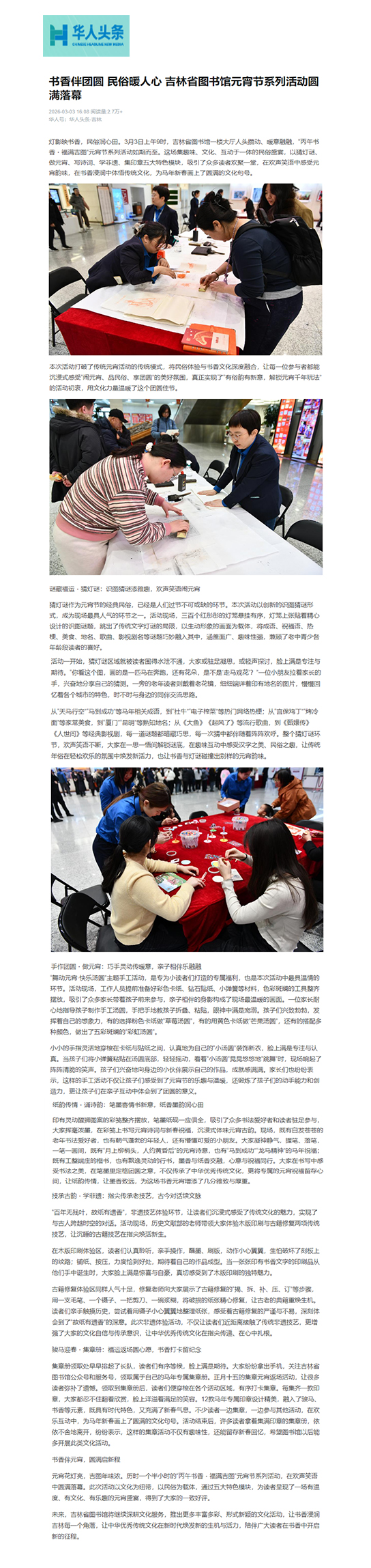 2026.3.3 《华人头条》 书香伴团圆 民俗暖人心 吉林省图书馆元宵节系列活动圆满落幕
